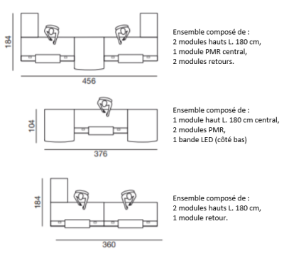 Ensemble composé d'1 module central haut + 2 modules pour personne à mobilité réduite L. 336 x P. 104 cm.