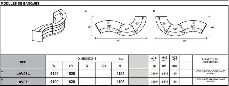 Banque d'accueil courbe. La façade est rythmée par des bandes coloris aluminium. Eclairage LED en partie haute et basse de la façade. Encombrement 419.9 x 162.9 cm.
