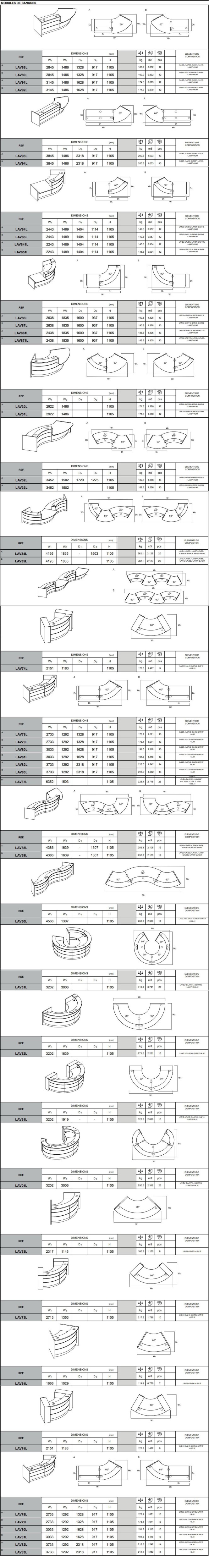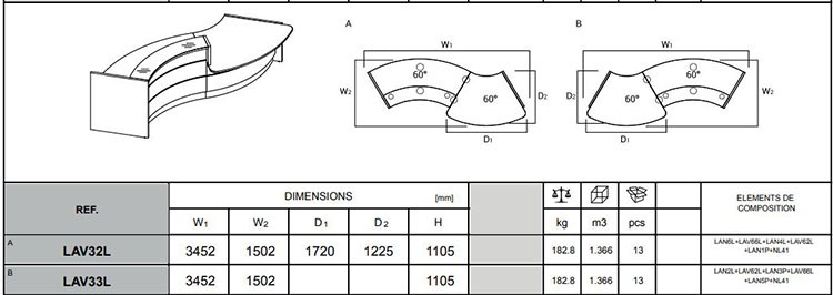 Banque d'accueil courbe avec 1 accès PMR. La façade est rythmée par des bandes coloris aluminium. Eclairage LED en partie haute et basse de la façade. Encombrement 345.2 x 150.2 cm.