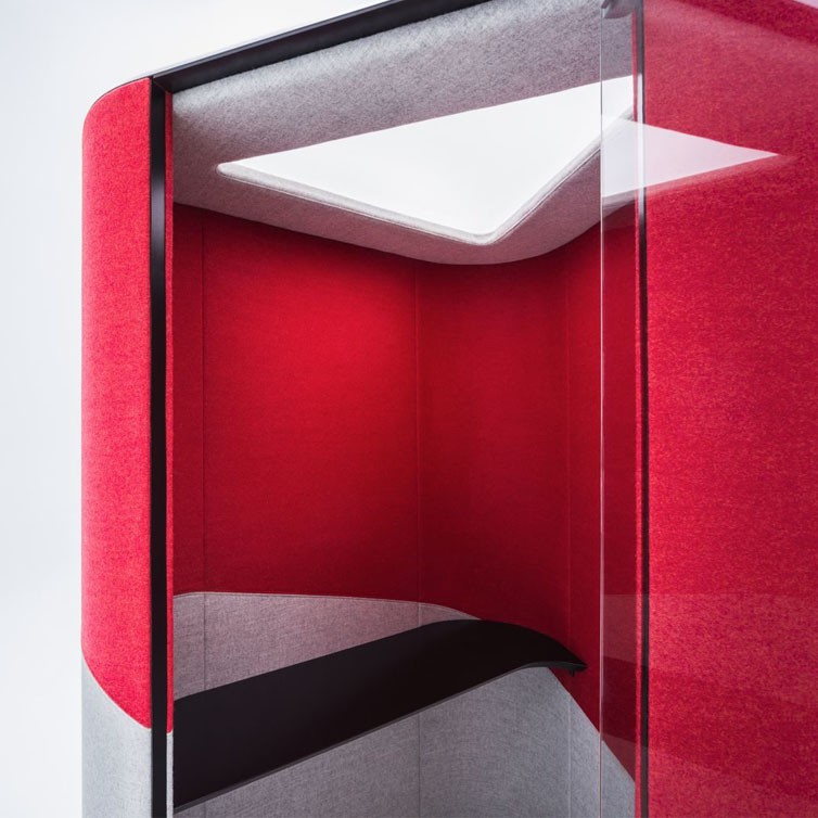 Descriptif Les zones de silence dans des espaces de bureau exigeants et dynamiques – les cabines Moji fonctionnent bien même dans les environnements les plus dynamiques. Leur construction modulaire et la forme ergonomique de la cabine téléphonique offrent à l’utilisateur un large éventail de possibilités, devenant, selon les besoins, un lieu de conversation téléphonique ou de travail isolé. Ces systèmes sont facilement modifiables. La forme caractéristique, inspirée des feuilles triangulaires de la fleur, rompt la monotonie des rangées régulières de bureaux, influençant la conception de l’intérieur et stimulant la créativité. Le confort de l'utilisateur est amélioré par: un éclairage automatique, une ventilation silencieuse et un plafonnier restituant la lumière de l'extérieur. Le matériau acoustique a été utilisé à la fois à l'intérieur et à l'extérieur de l'enveloppe, ce qui améliore la qualité acoustique non seulement de la cabine, mais de l'ensemble d’espace.