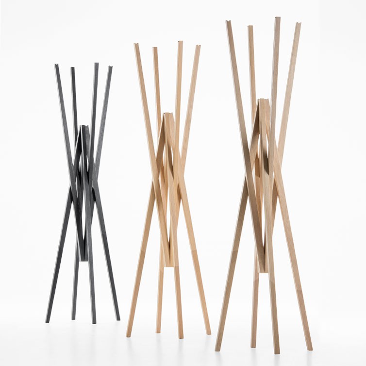 Descriptif Le nom du porte-manteau reflète la forme symétrique créée par rotation et réflexion d’un support droit unique. Ce principe de conception réduit la consommation de matériaux, permet un montage et démontage facile ainsi que le transport "flat-pack". Les lignes droites des pyramides juxtaposées changent dynamiquement l'apparence du portemanteau, de la symétrie statique à une forme dynamique et vibrant, en fonction de l'angle de visualisation.