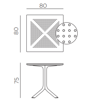 Conçue tout spécialement pour occuper peu d’espace et idéal pour l'extérieur et l'intérieur, Cap est une table carrée professionnelle en résine fibre de verre, à pied central à quatre branches, dotée d’un plan DurelTop comportant un motif à cercles ajouré photogravé.
