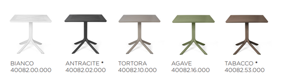 Table avec pied centrale à 4 branches, plateau solide et durable en DurelTOP en polypropylène fiberglass traité anti-UV et coloré dans la masse. Résine recyclable. Pour intérieur et extérieur.