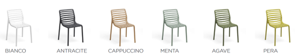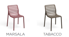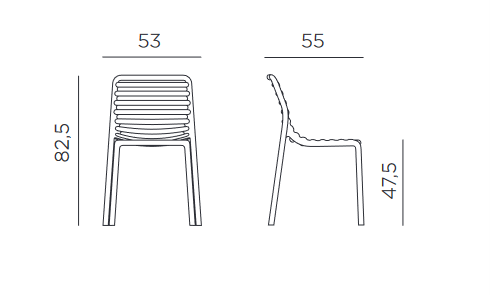 Chaise d'extérieur monobloc sans accoudoirs, colorée, en résine de fibre de verre. Maniable, empilable, facile à désinfecter et entièrement recyclable.
